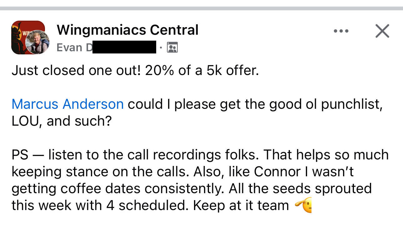 Use our Coffee Date framework to structure clean revenue-share deals. No pressure, no performance. Some members even have Marcus join to help close the partnership.